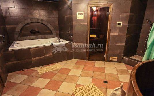Зал с хамамом, парной, джакузи, купелью комнатой отдыха.